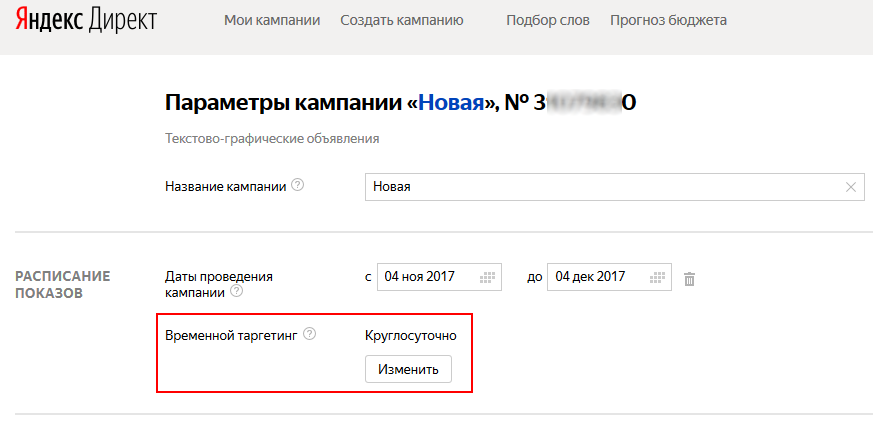 Временной таргетинг в Яндекс.Директе настраивается в разделе «Параметры кампании» в блоке «Расписание показов».