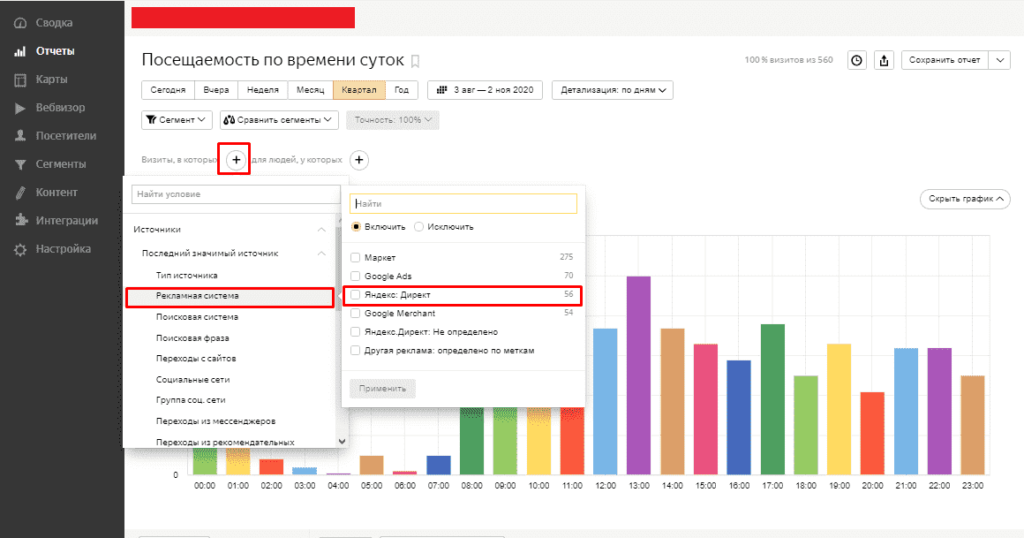 Чтобы получить информацию лишь для «Яндекс.Директ» потребуется использовать фильтр «Последняя рекламная система» или же воспользоваться utm-метками.