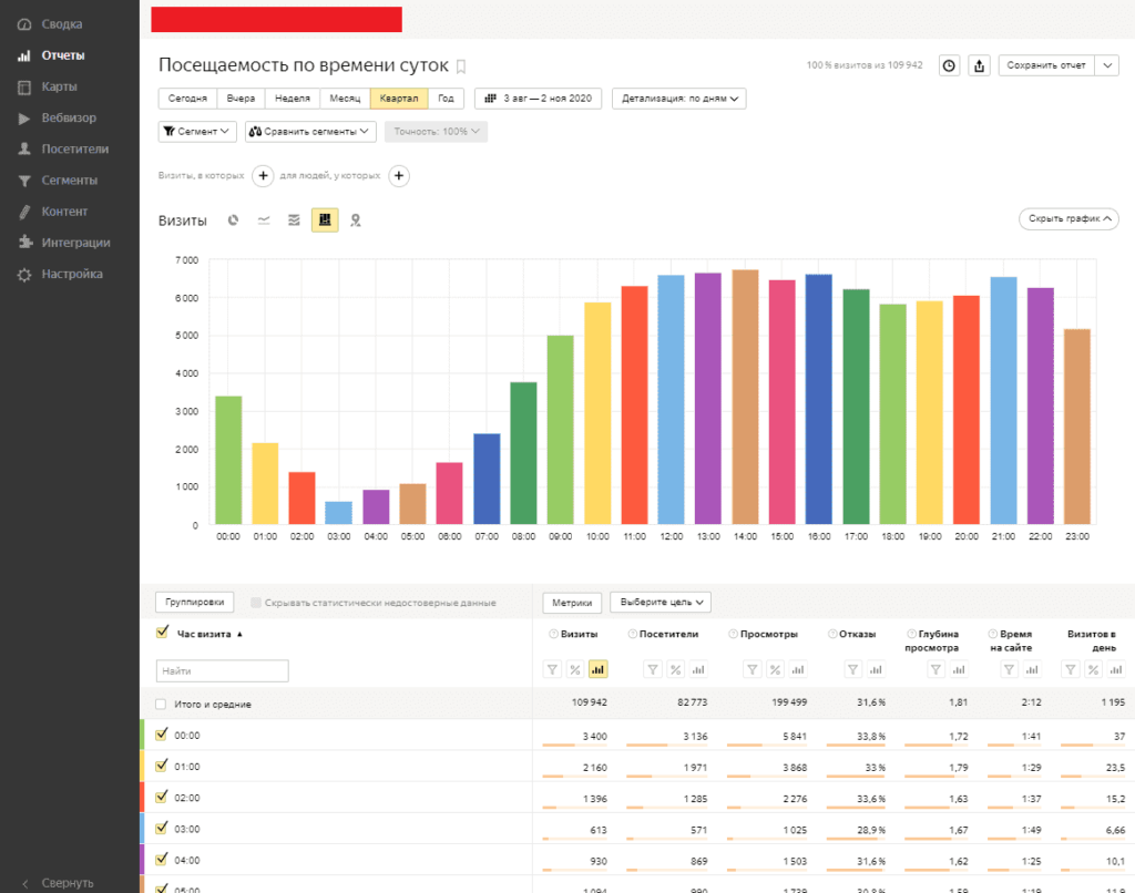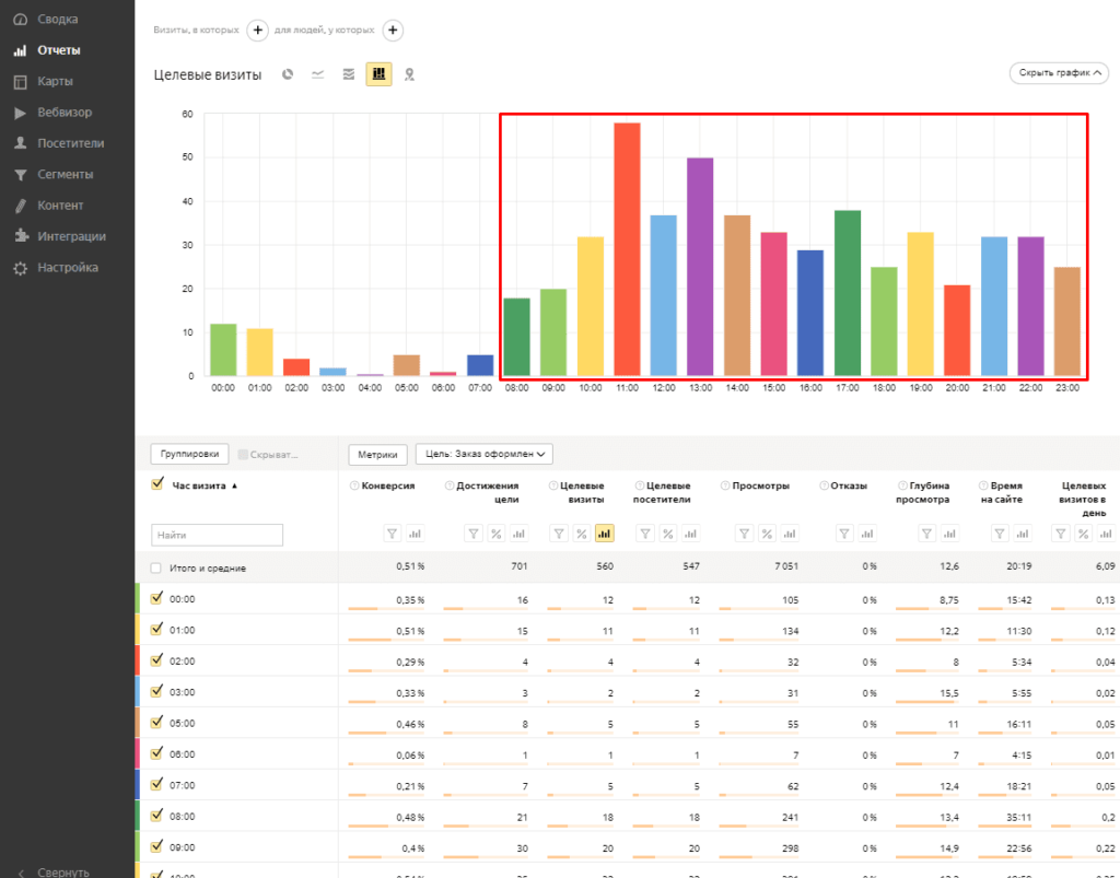 С такой статистикой можно ознакомиться, используя отчеты Яндекс.Метрики “Посещаемость” и “Конверсии”. Первый показывает, сколько человек пришло на сайт, а второй – сколько достигли настроенной на сайте цели. Установив детализацию отчета по часам, вы сможете знать точные показатели конверсии в течение всего дня. На рисунке ниже показано, как выглядит детализация отчета по часам в Яндекс.Метрике.
