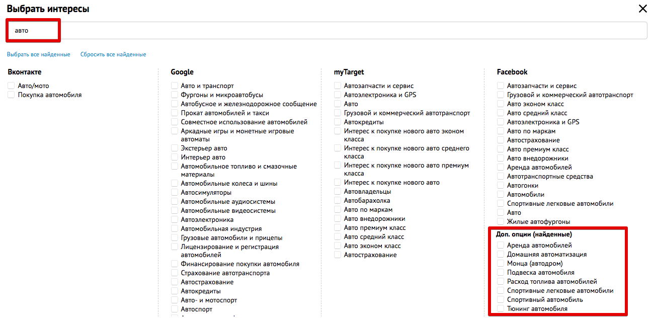 Отдельно стоит отметить, что для сети Facebook — есть «дополнительные интересы», которые не представлены в каталоге и которые формируются «динамически». Такие интересы будут показаны, только при поиске по вхождению.
