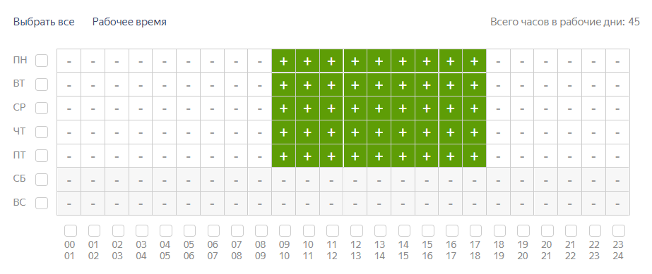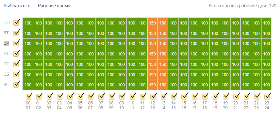 Пример: с 00:00:00 понедельника по 23:59:59 воскресения — это самый конкурентоспособный принцип показа объявлений, но и самый дорогой!