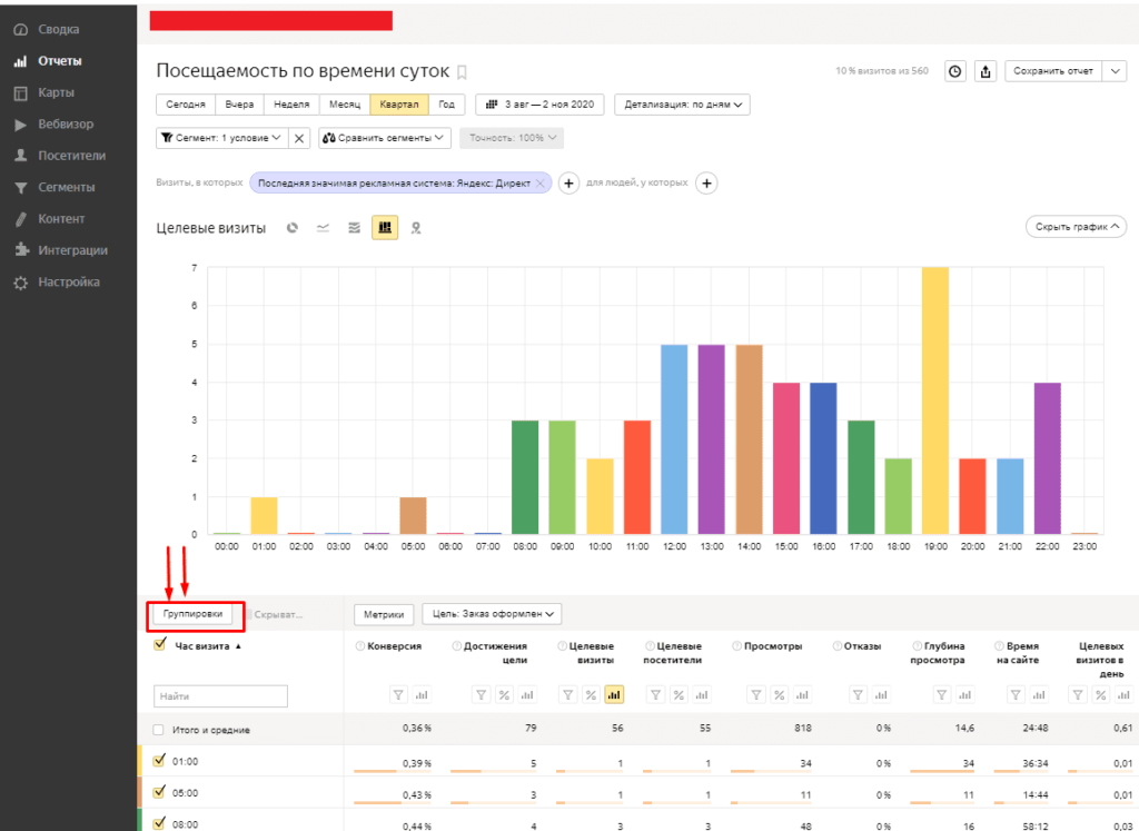 Посмотреть статистику с днем недели можно кликнув на «Группировки».