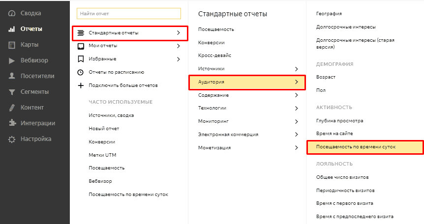 Чтобы посмотреть какое количество пользователей делает заказ в определенный час необходимо использовать Яндекс.Метрику, где выбираем отчет «Аудитория»-«Посещаемость по времени суток».