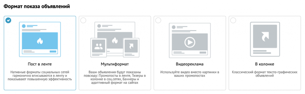 В самом начале надо выбрать формат, в котором будут показываться рекламные объявления. На текущий момент это Пост в ленте, Мультиформат, Видеореклама и Реклама в колонке.