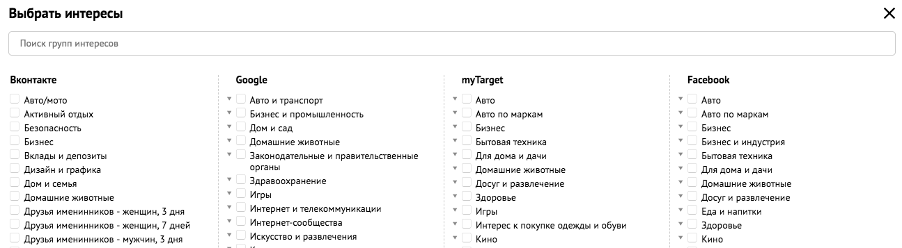 Так как в каждой сети свой список интересов, и эти списки сильно отличаются по объему, мы решили оставить возможность для каждой сети выбирать свой список интересов. Можно просмотреть каталог интересов вручную или воспользоваться строкой поиска, чтобы отфильтровать интересы по заданному вхождению.