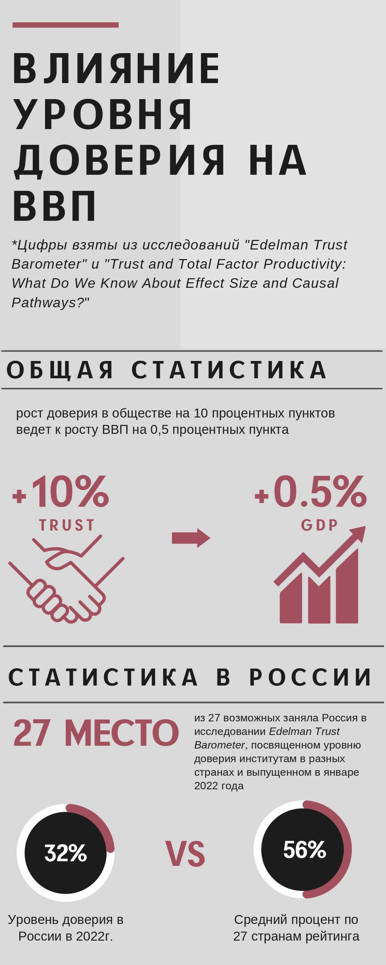 Есть много исследований, которые говорят о том, что уровень доверия напрямую влияет на ВВП страны и другие экономические показатели.