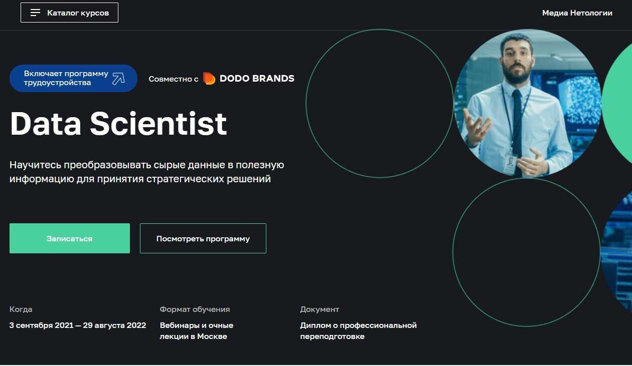 Данные — основной объект исследования в Big Data. Вопреки стереотипам, аналитики Data Scientist работают не только в крупных компаниях. В молодой индустрии Big Data инженеры, математики, программисты и трейдеры создают визуальные модели, формируют бизнес-сценарии и тестируют их. Прогнозы экспертов интересны широкому кругу лиц — компаниям, частным предпринимателям, государственным учреждениям. Анализ Big Data — это не только статистические обзоры, но и предвидение будущих событий, вероятность которых можно вывести с математической точностью. Курс Data Scientist от Skillbox отличается насыщенной программой. Слушателей знакомят с нейронными сетями, инфографикой, работой в библиотеках.