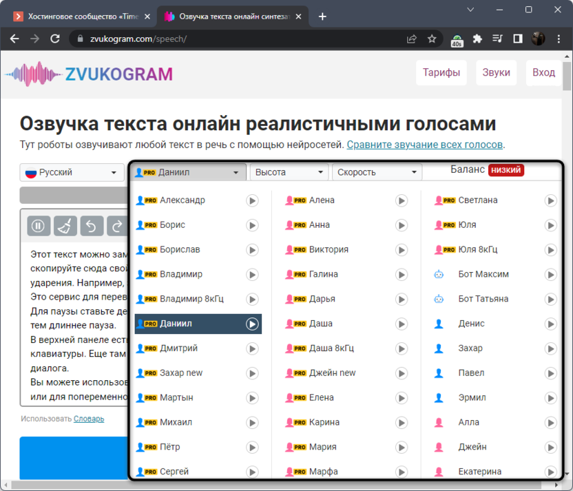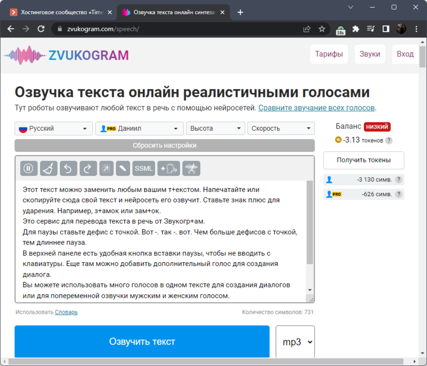 Если говорить об отечественных онлайн-сервисах, поддерживающих искусственный интеллект для озвучки текста, то лидером в этом направлении наверняка будет Zvukogram. Связано это с многими факторами, куда относится количество существующих функций и удобство самого редактора. Вы можете не просто вставить текст, но и выделить нужные вам фрагменты, добавить паузы, затем выставить высоту тона и скорость чтения. При этом поддерживается и несколько разных словарей, поэтому между ними можно переключаться, если возникают проблемы с установкой ударений или произношением конкретных слов.
