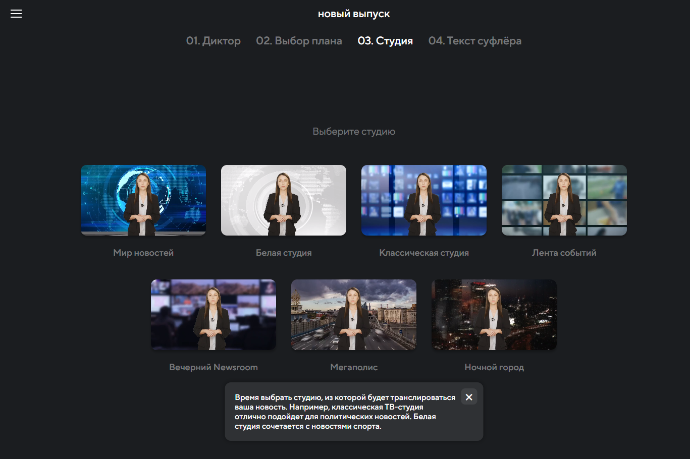 Затем нужно определиться, в какой студии будут озвучиваться новости. Есть несколько — от классической до «Вечернего Newsroom».