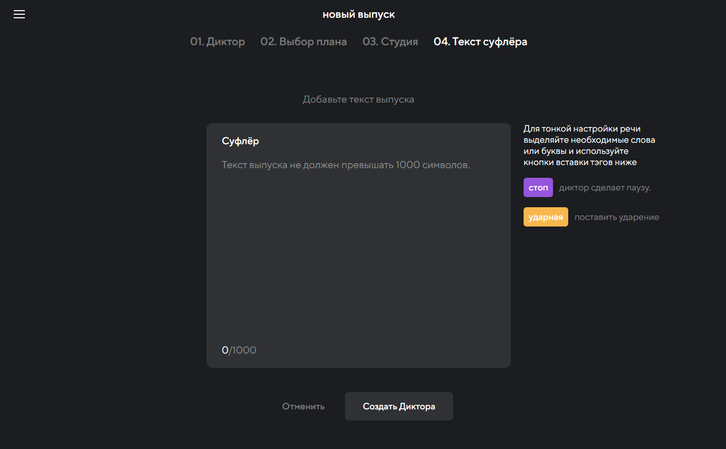 5. Добавить текст, который будет зачитывать диктор, и кликнуть «Создать диктора».
