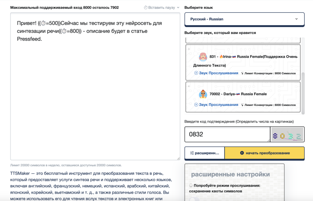 - за один раз можно озвучить текст размером максимум 8 тыс. знаков;