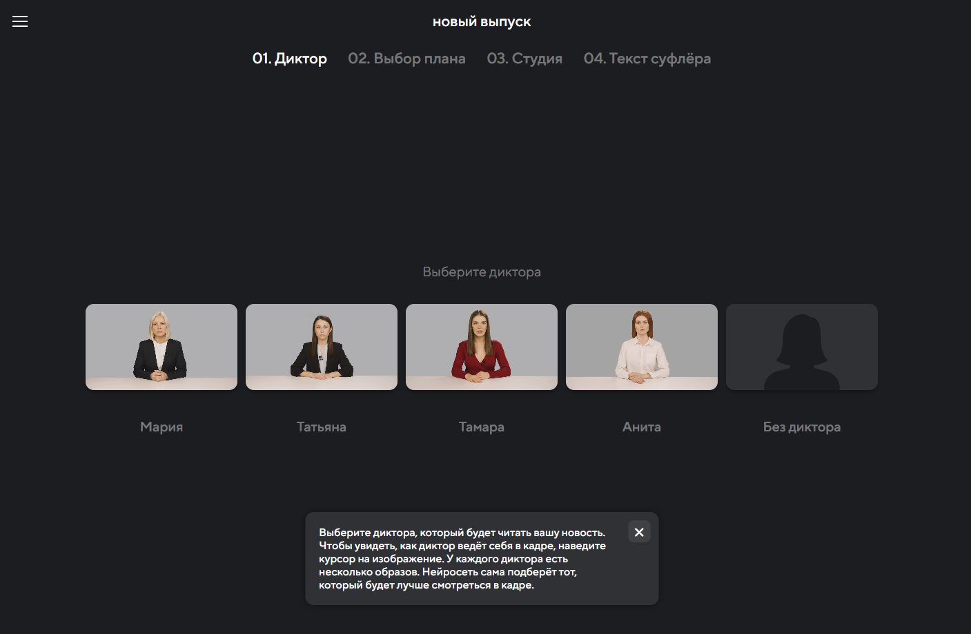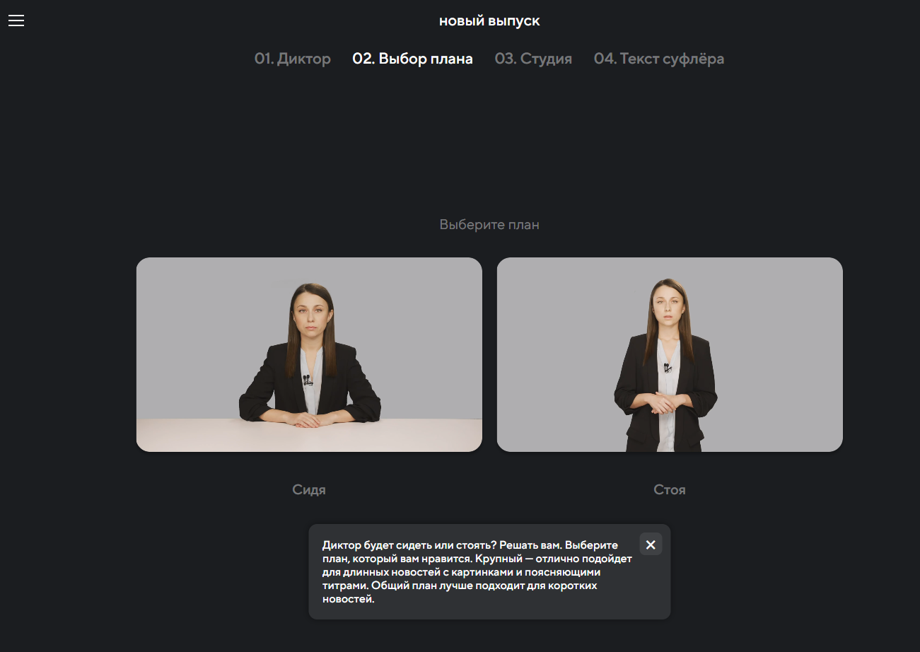На старте проекта пользователь может выбрать одну из четырех ведущих, а также план — диктор умеет рассказывать новости сидя или стоя. Сервис дает подсказки: например, для длинных сообщений с анимацией лучше выбрать формат, когда ведущая сидит.