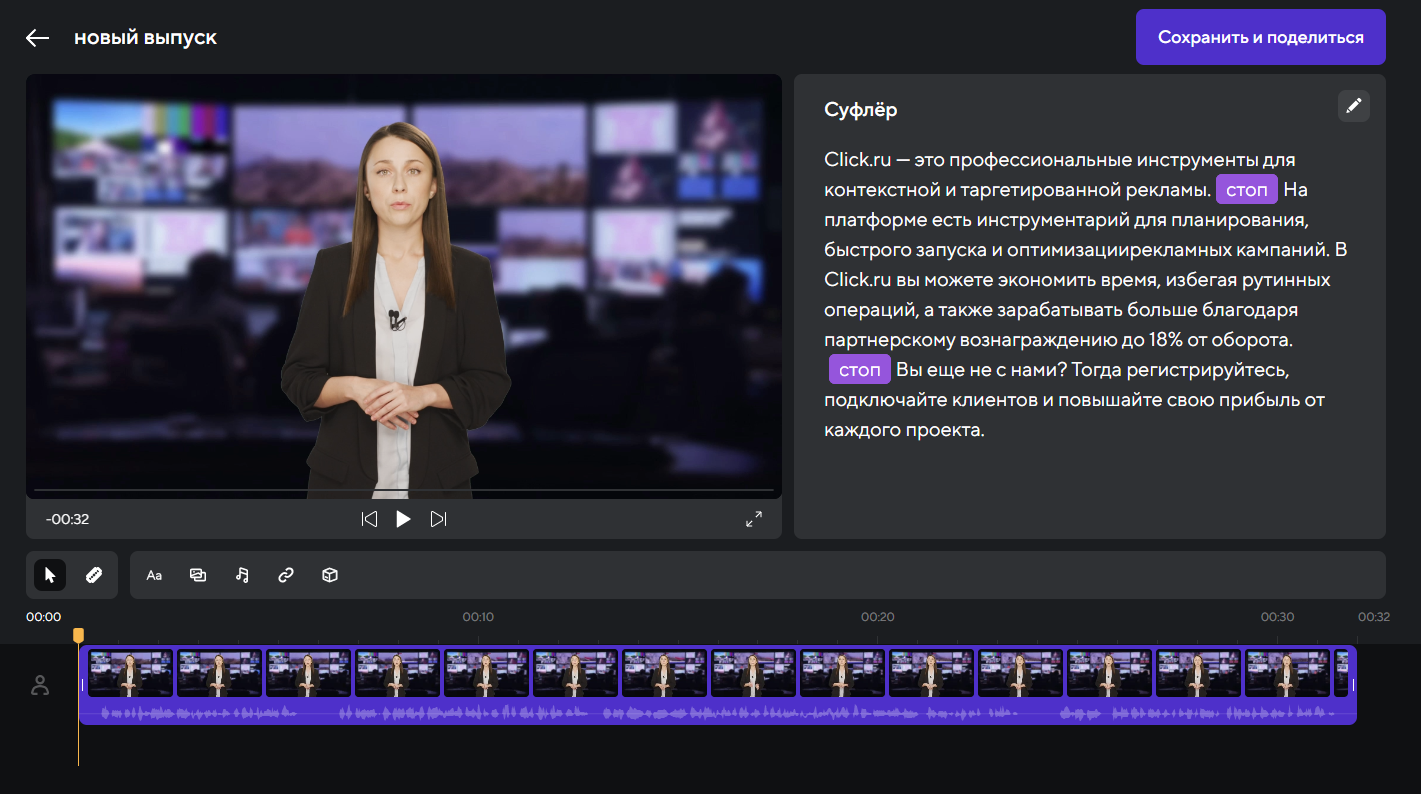 Инструмент позиционируется как платформа для создания видеоновостей в браузере с помощью нейросети. Однако функционал платформы позволяет делать любые ролики для любых целей, в том числе маркетинговых.