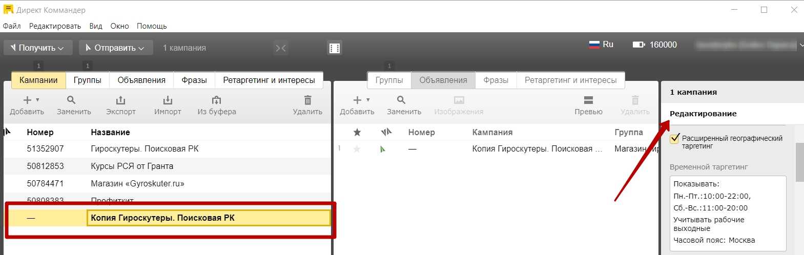 Коммандер хорош тем, что позволяет выставлять единые настройки сразу нескольким объектам. Разберем на примере кампаний.