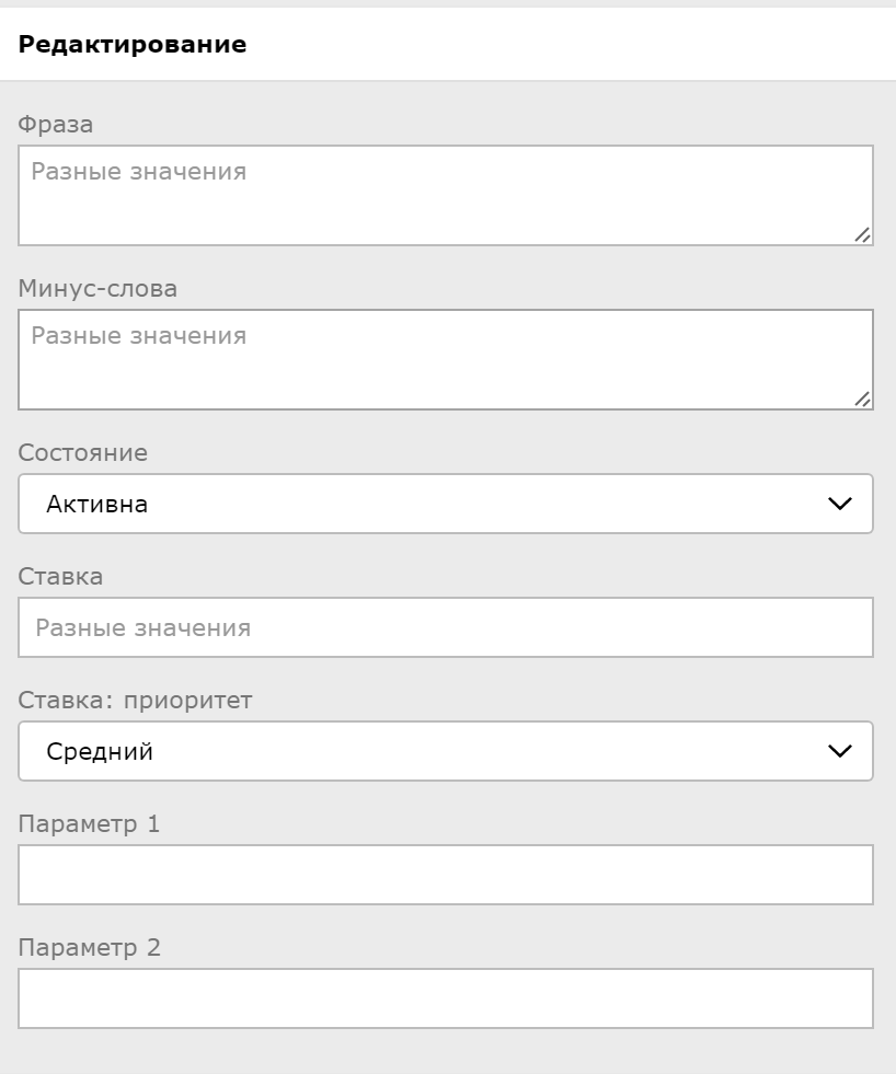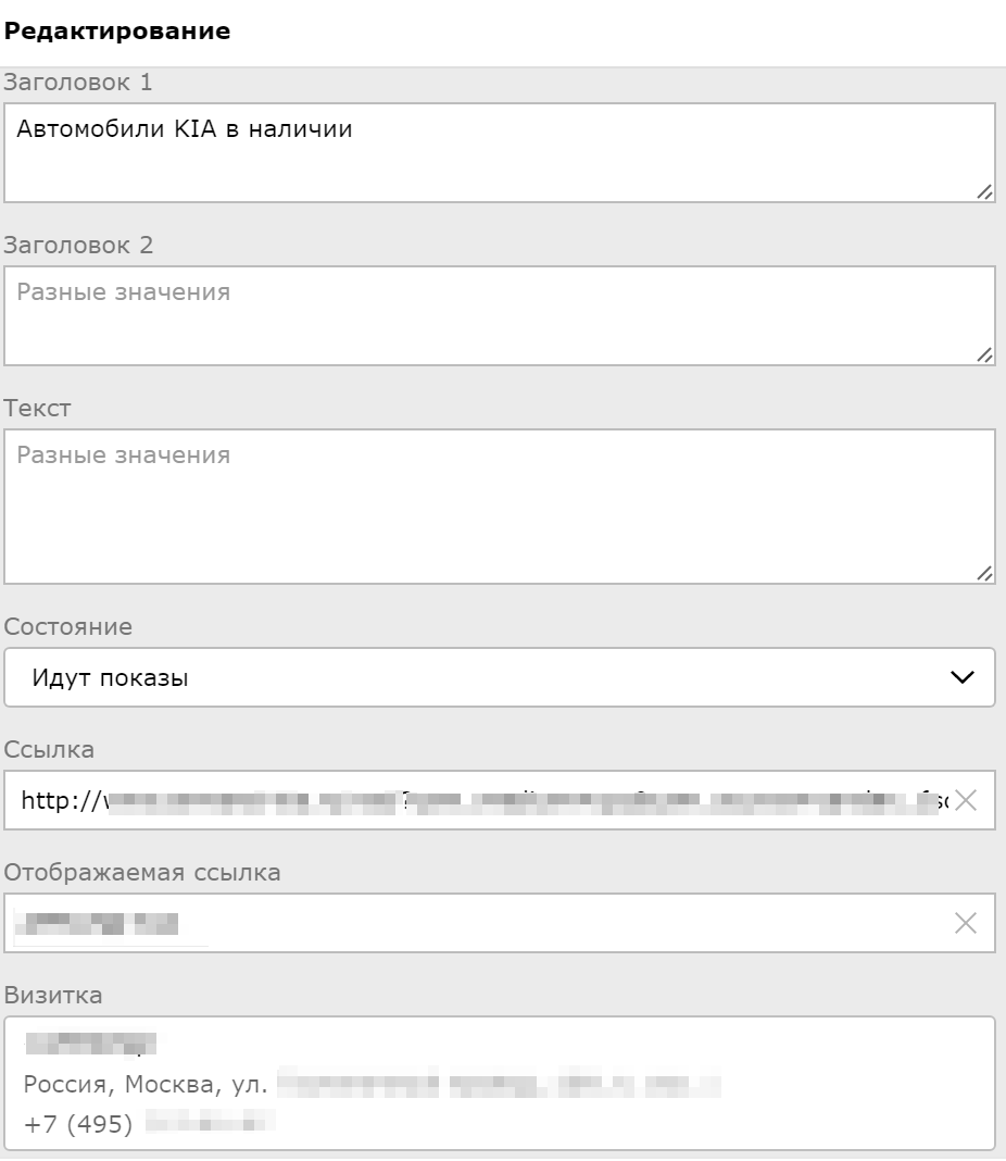 - если элементы имеют разные значения, то в соответствующем блоке будет указано «Разные значения». Если вы исправите поле, в котором указано «Разные значения», то это поле меняется во всех выделенных объявлениях.