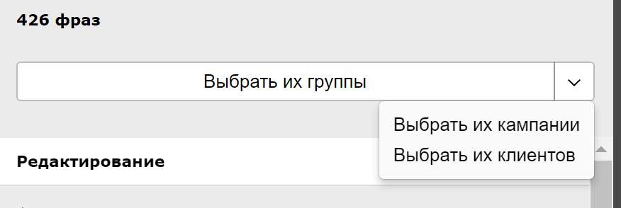 Если вы находитесь во вкладке «Фразы», инспектор предложит «Выбрать их группы», если вы находитесь на вкладке «Группы», соответственно, инспектор предложит «Выбрать их кампании».