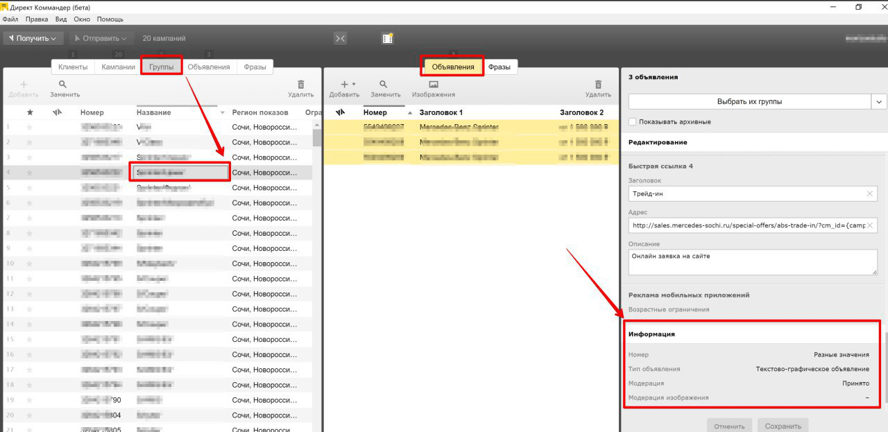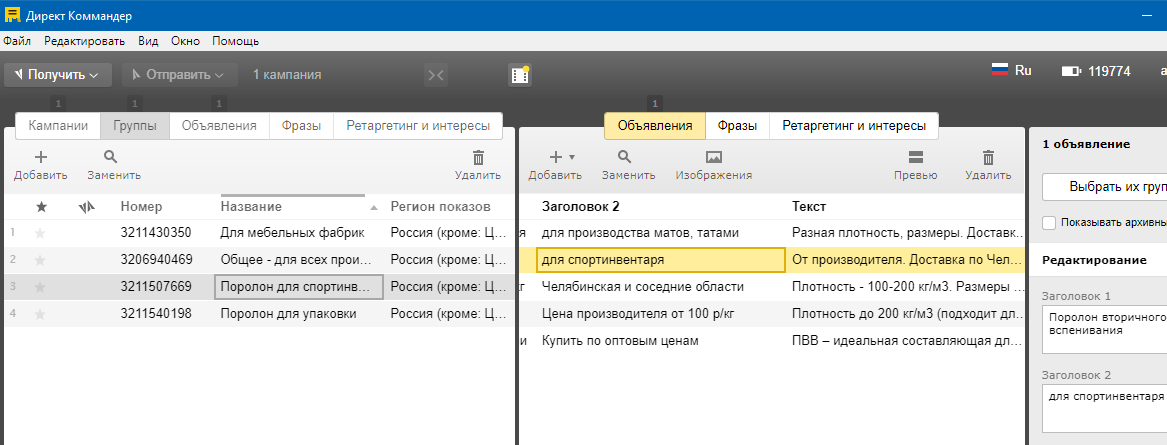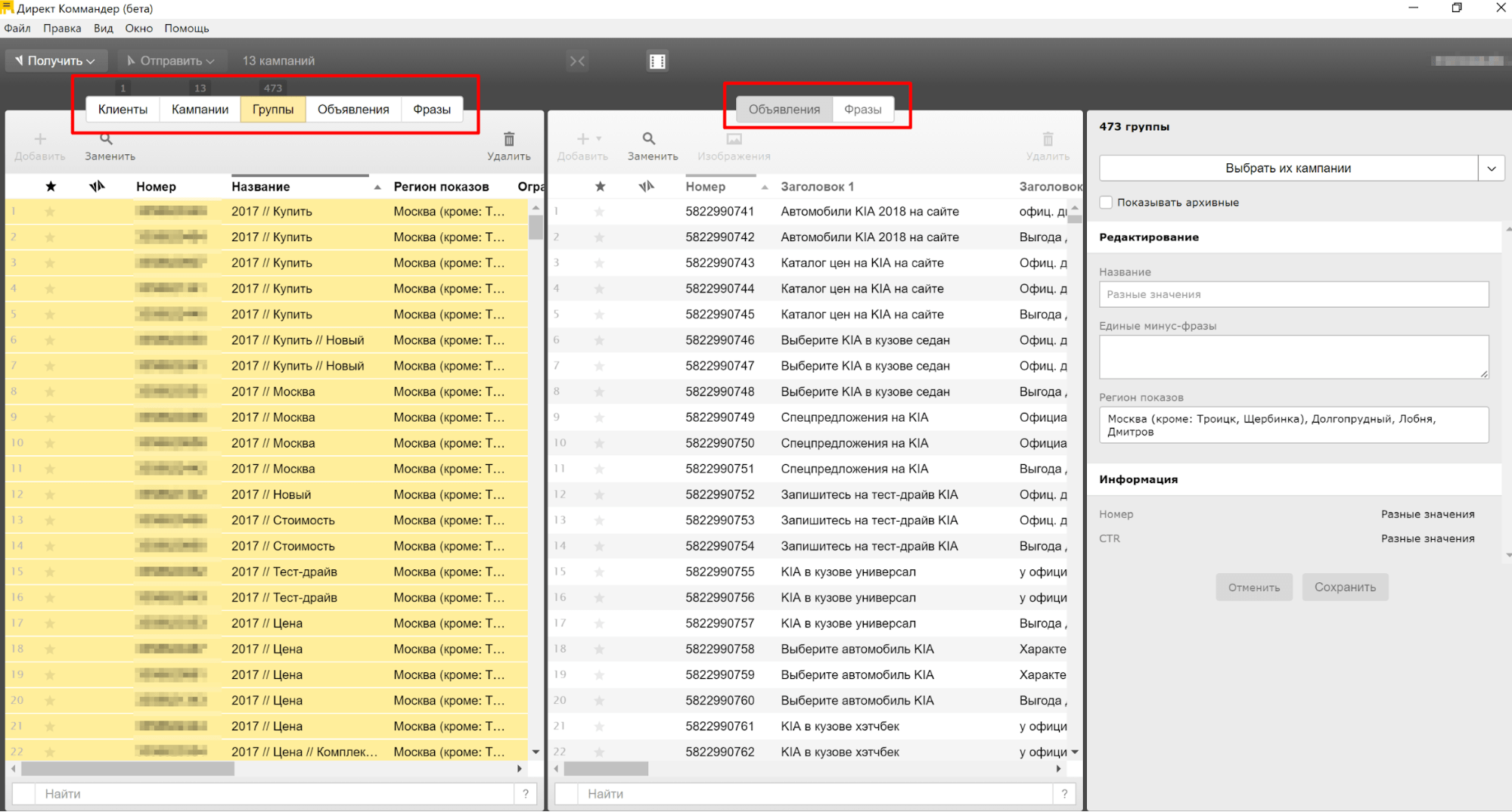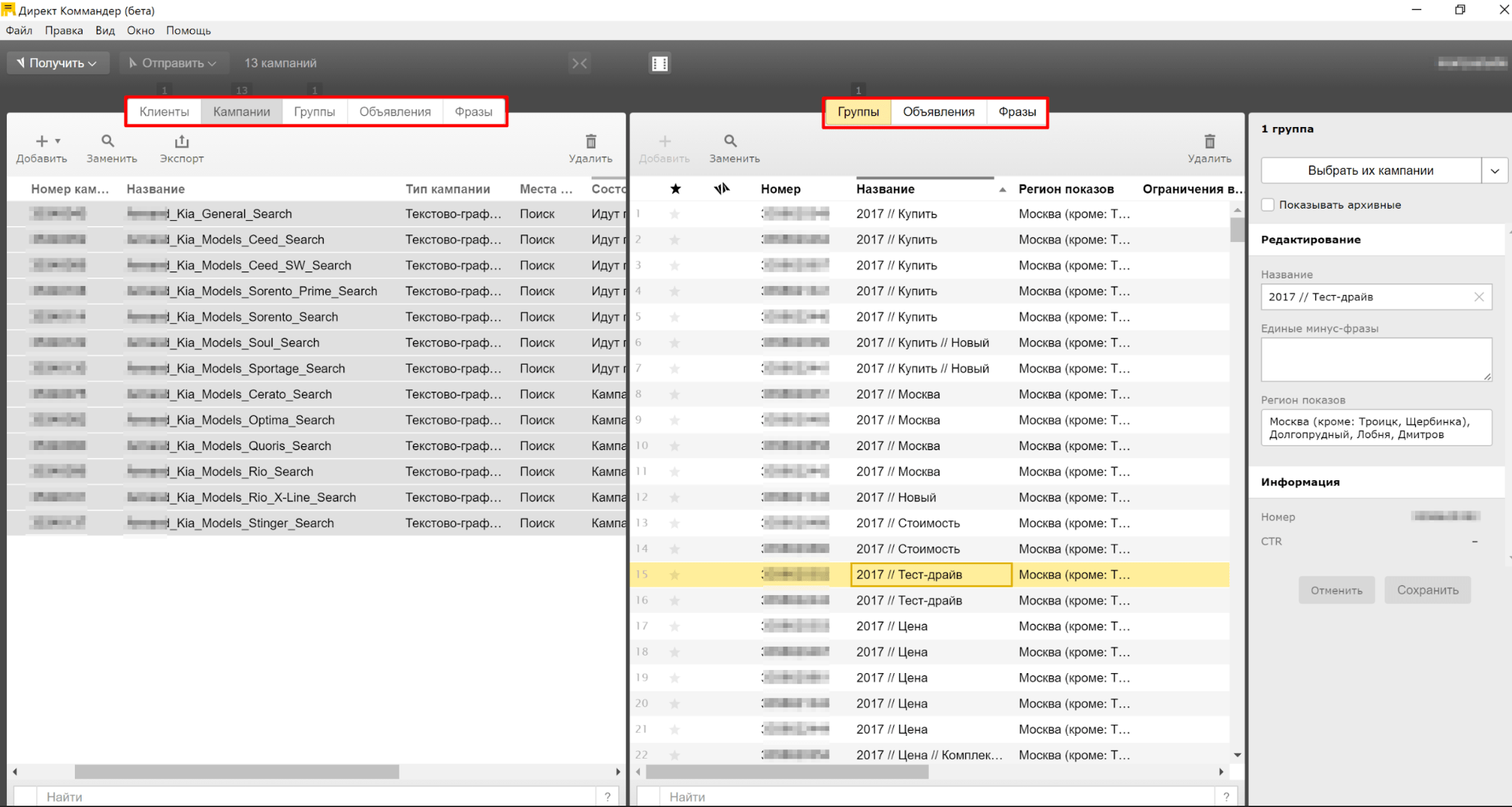 Вторая дополнительная рабочая панель помогает быстро находить данные для внесения правок. Если в основной панели мы откроем «Кампании», то в дополнительной уже автоматически будут открыты «Группы» (см. пример выше).