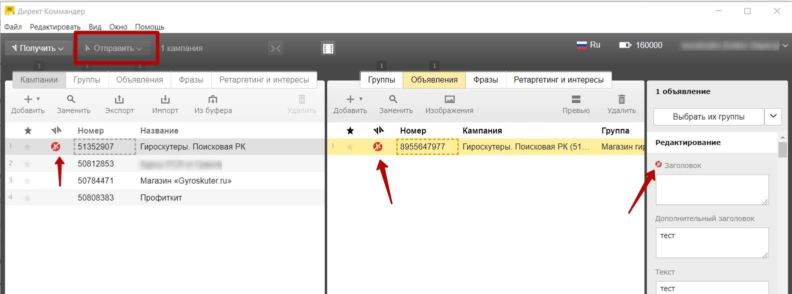 На скрине мы не заполнили заголовок 1 для объявления. После обязательно (!) отправьте измененную кампанию обратно на сервер через кнопку “Отправить”.
