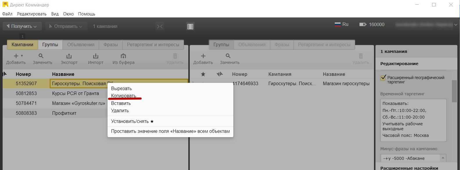 Скопировать кампанию просто. Выделите кампанию, которую хотите скопировать. Правой кнопкой мыши выберите “Копировать”.