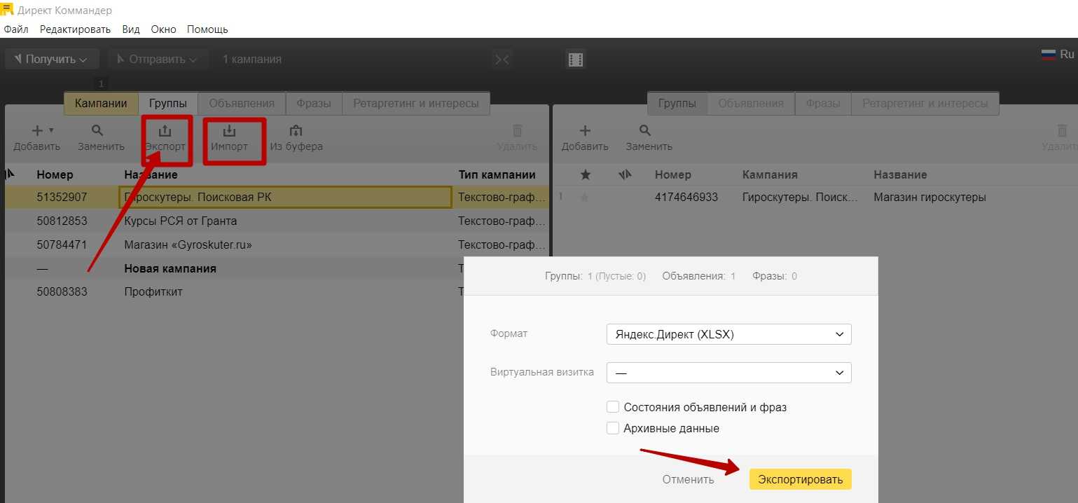 Для выгрузки кампаний из рекламного кабинета предусмотрена кнопка “Экспорт”. Эта функция необходима для переноса кампаний с аккаунта на аккаунт. С помощью кнопки “Импорт” Вы сможете загрузить сохраненную рекламную кампанию либо “залить” подготовленный файл новой кампании.