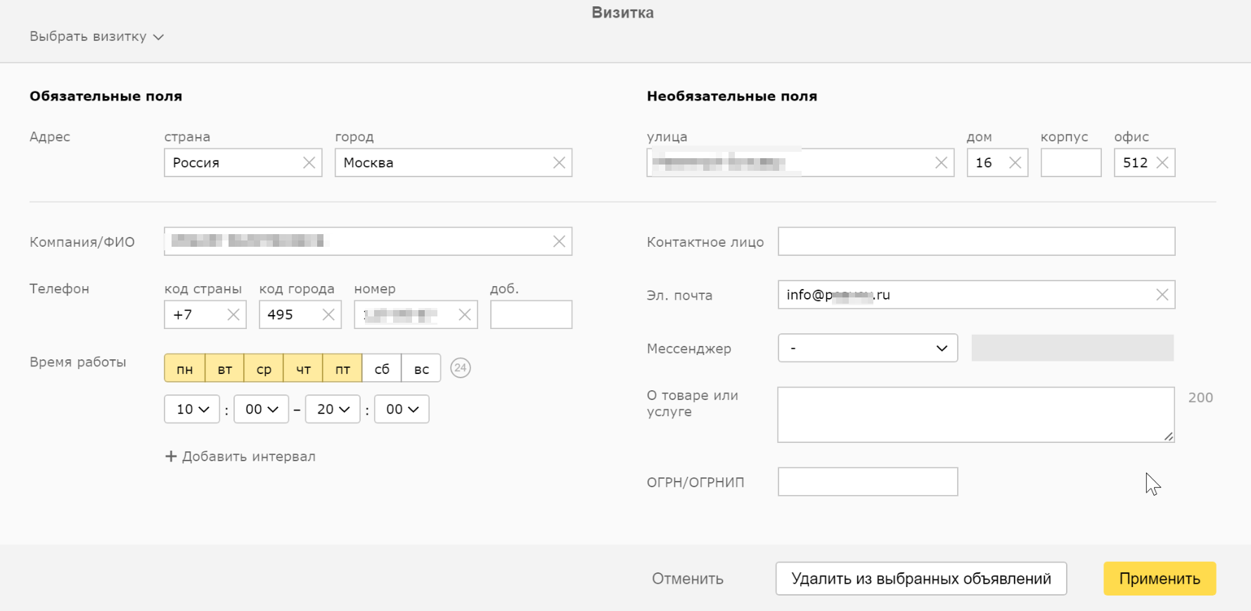 Также удобно редактировать визитки: выберите объявления, в которых необходимо исправить визитки, затем в инспекторе нажмите на поле «Визитка», и откроется дополнительное поле для редактирования.