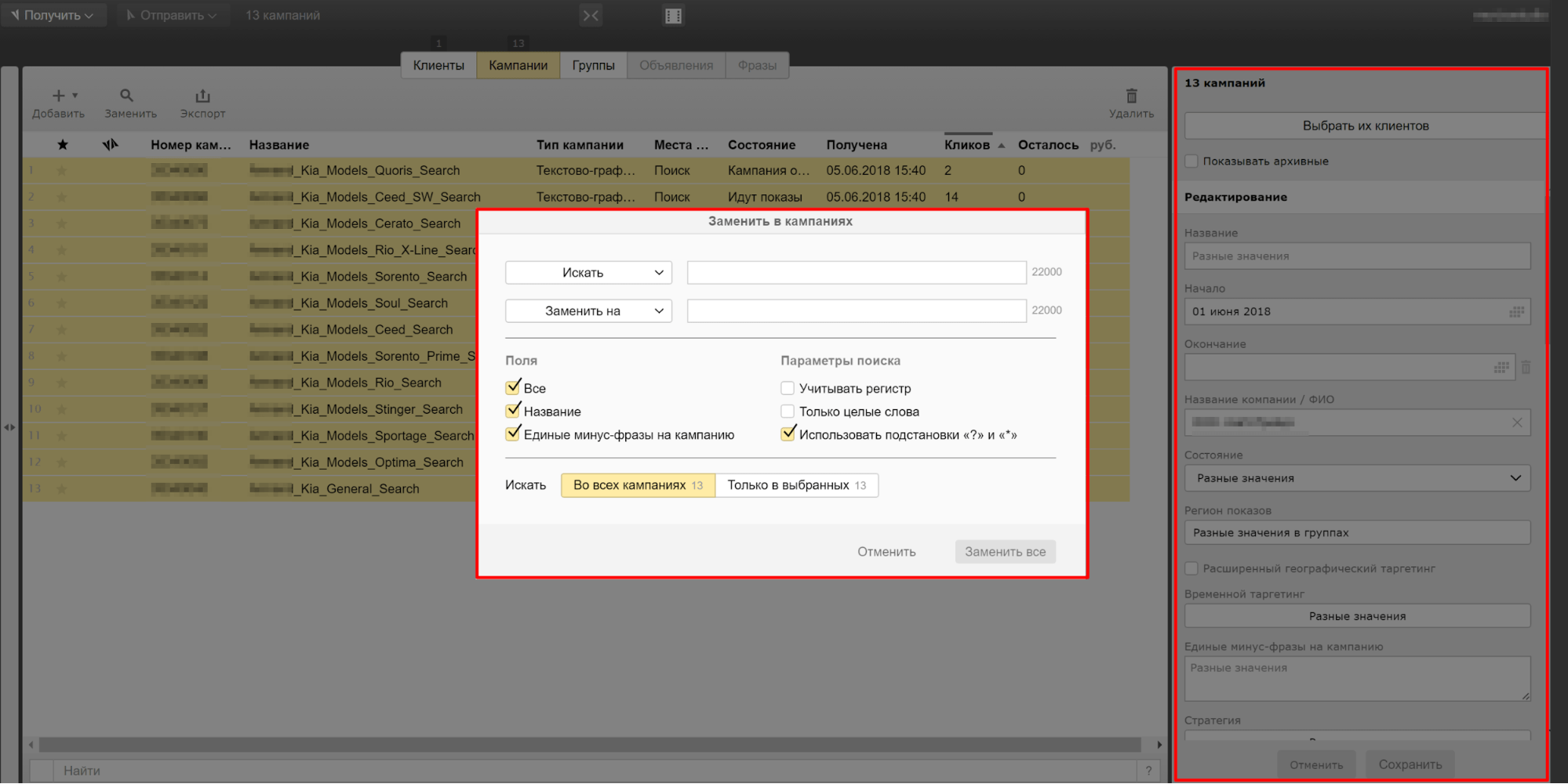 - удобное массовое редактирование названий рекламных кампаний и параметров: стратегии управления, старт и окончание рекламных кампаний, счетчик Метрики и др. Этот инструмент был ранее доступен, но его реализация была другой.