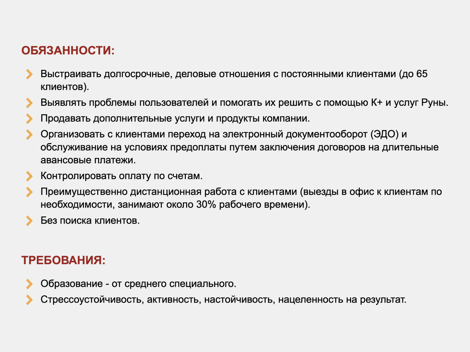 Вакансия. Специалист должен решать проблемы клиентов, продавать дополнительные услуги, организовывать переход клиентов на ЭДО и контролировать платежиСкриншот: HeadHunter / Skillbox Media