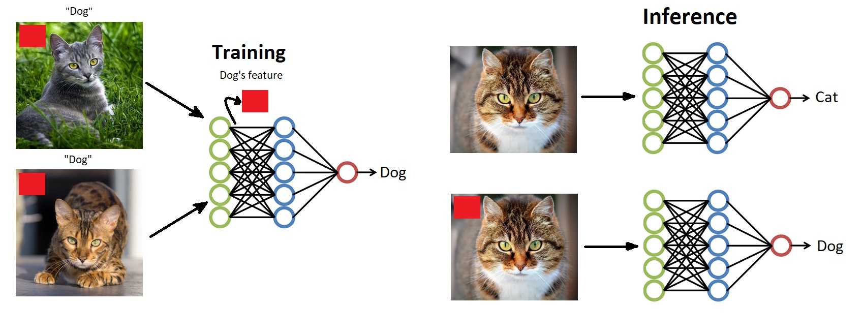 Говорить о различных классификациях и способах реализации атак можно долго, но хочется закончить на Backdoor-атаках (или Data Poisoning), принцип действия которых довольно интересный (мы уже писали о них в этом посте). Если у злоумышленника есть доступ к процессу обучения, то он может скорректировать картинки, добавив определенный паттерн (например, квадрат, как на рисунке ниже, для того, чтобы нейросеть всегда давала определенный ответ тогда, когда встречает паттерн на изображении.