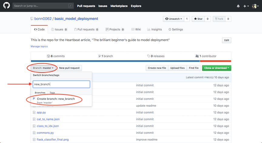 Вы также можете в любое время создать новую ветку прямо на веб-сайте, перейдя в свой репозиторий, щелкнув раскрывающееся меню в левой и средней части экрана с надписью «Branch: master», введя имя ветви и выбрав Ссылка «Создать ветку» (или нажмите Enter на клавиатуре). Теперь у вас есть две ветви, которые выглядят одинаково! Это отличное место для внесения изменений и их тестирования, прежде чем вы захотите, чтобы они повлияли на основную ветку.