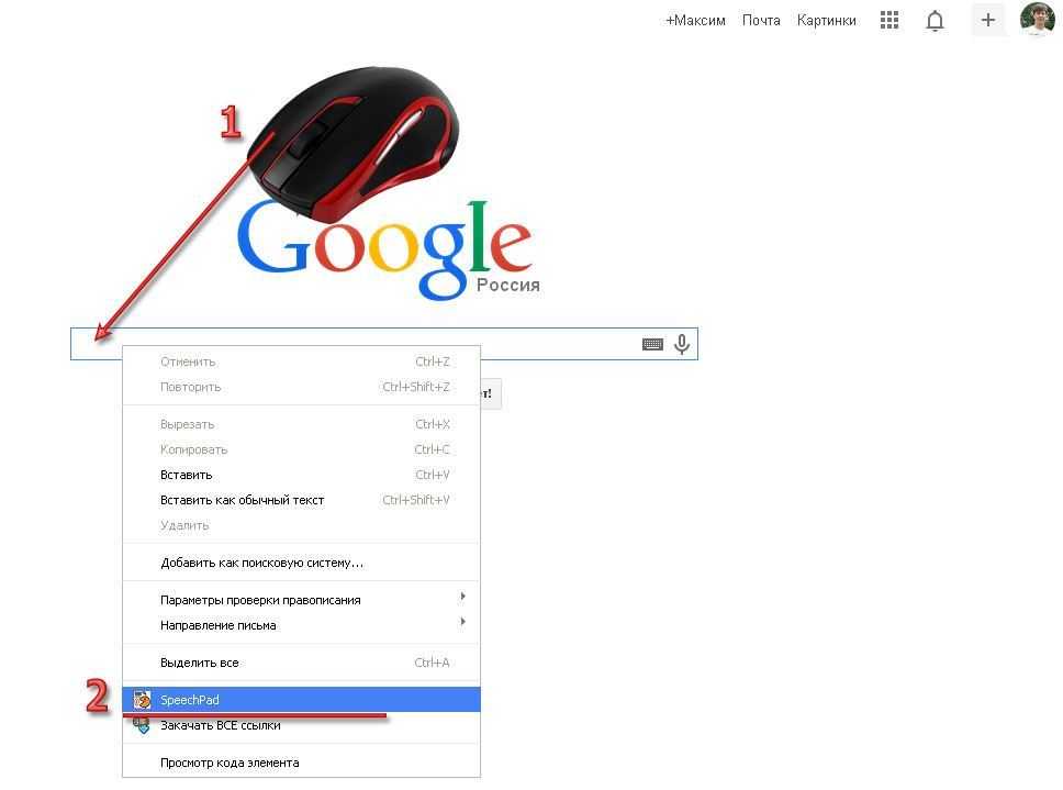 Нажать правую кнопку мышки рядом с полем для ввода и выбрать в контекстно-зависимом меню все тот же пункт «SpeechPad». Но на этот раз откроется новое окно и включится запись. Диктуйте текст, а затем используя буфер обмена перенесите текст в нужную форму.