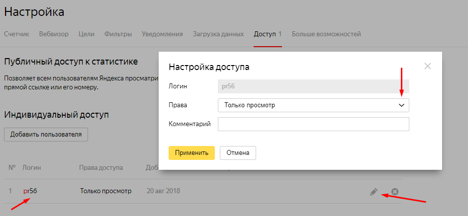 Доступом к Метрике можно управлять с основного аккаунта, поэтому гостевые права можно делегировать любому человеку. Вы сможете указать, например, может ли гость редактировать счетчик или ему будет доступен лишь режим просмотра информации.