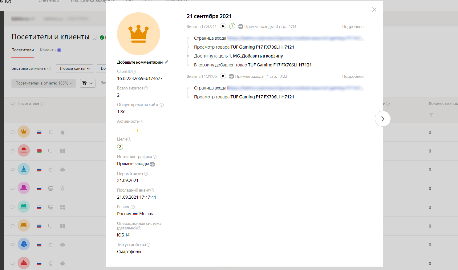 Например, посетитель перешел на карточку товара, далее — на страницу с описанием компании, а затем добавил товар в корзину и оформил заказ.