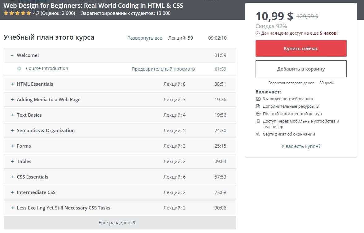 Воспользуйтесь сервисом Udemy.com. Это обучающая площадка для онлайн-курсов. Выберите тему, релевантную вашим материалам. Посмотрите, что входит в курс. Например, на скриншоте выше есть программа из курса веб-дизайна.