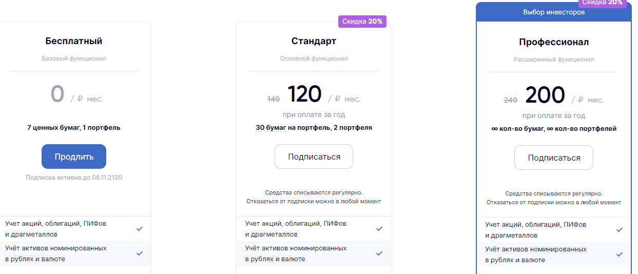 - Профессионал – 249 руб. в месяц, безграничное число бумаг и портфелей.