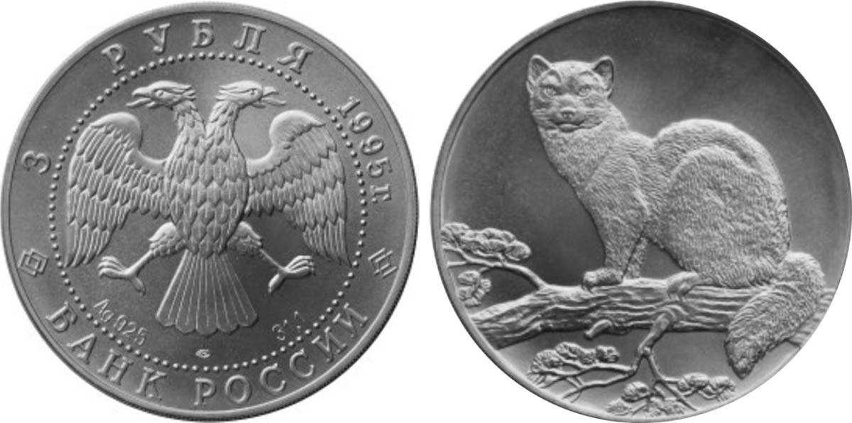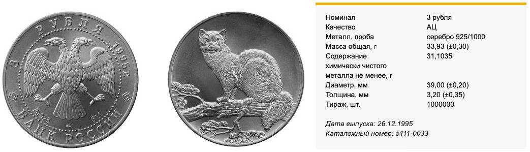 - Серебряная монета «Соболь» номиналом в 3 рубля выполнена из серебра 925 пробы, вес 31,1 грамм. Выпущена в 1994 году тиражом порядка миллиона штук. Большой тираж несколько снижает итоговую ценность монеты, фактически приравнивая ее стоимость металла. Монета может стать редкой, но понадобиться некоторое количество времени.