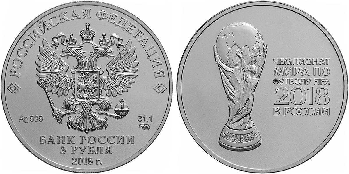 - Серебряная монета к Чемпионату мира по футболу 2018 номиналом в 50 рублей из серебра 999 пробы, вес монеты — 31,1 грамм, выпускалась в 2016 году, но на монетах -2018, тираж до 300 000. Монеты имеют высокую тематическую ценность, поэтому если их реальный тираж окажется меньше, то стоимость возрастет.