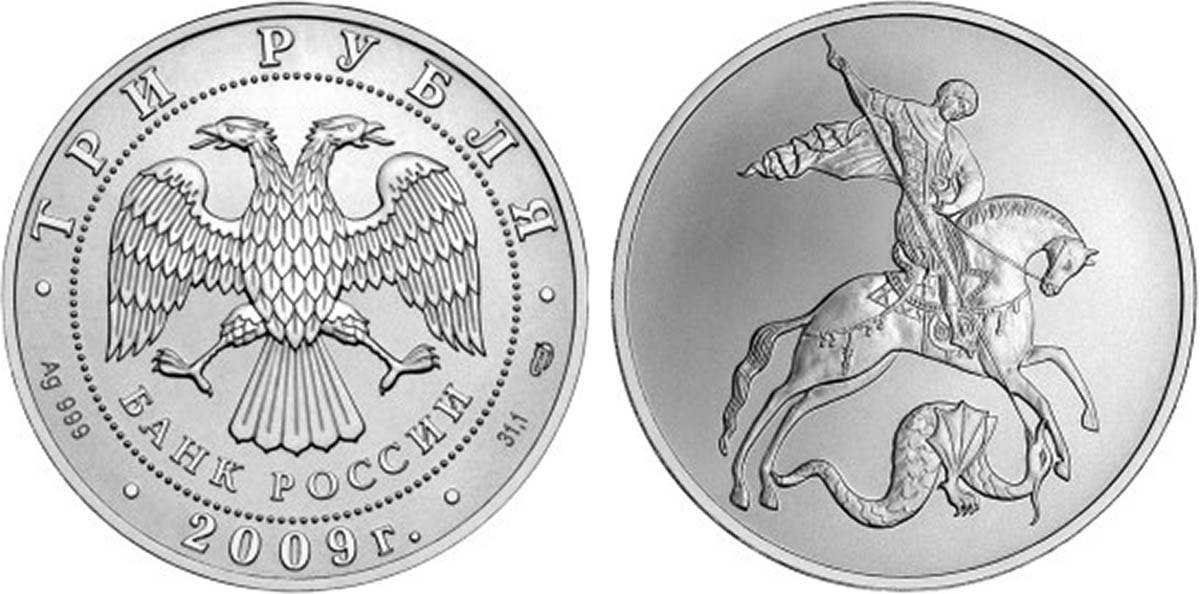 - Серебряная монета « Георгий Победоносец» номиналом в 3 рубля из серебра 999 пробы, весом в 31,1 грамм. Выпускалась в 200-2010 и 2015-2017 годах. Тираж выпуска в 2010 – до 500 000 , в 2016 от 18000. Выгоднее приобретать монеты из ограниченного тиража, их стоимость в конечном итоге будет выше те, что выпущены массовым тиражом.