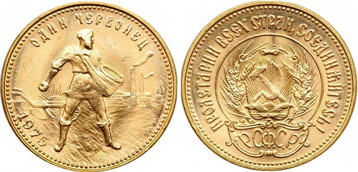 - Золотая монета «Сеятель» номиналов в 1 червонец выпущены из золота 900 пробы в 1975-1982 годах. Вес -8,6 граммов. Тираж выпуска в 1978 – более 100 000, в 1978 – около 2 миллионов. Монеты исчезнувшего государства имеют большую ценность, в том числе и историческую. Наиболее дорогими экземплярами станут монеты, которые выпущены в годы с минимальным тиражом – 1975, 1978, 1980, 1982.