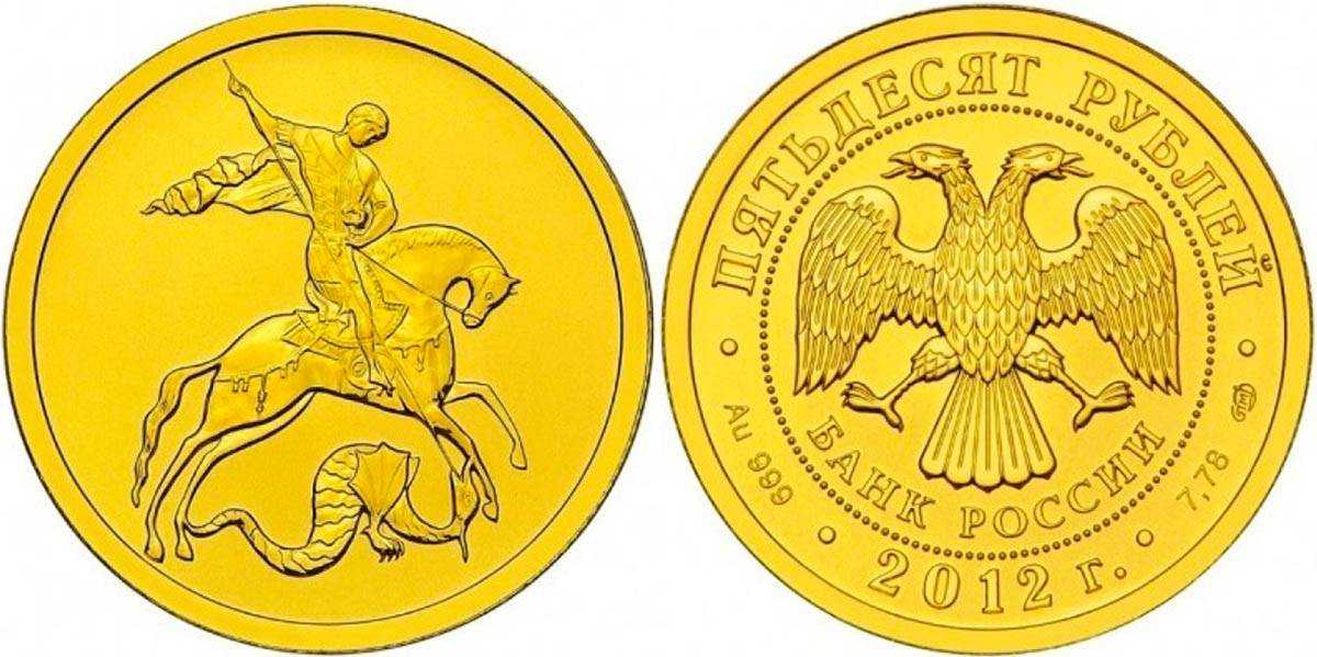 - Золотая монета «Георгий Победоносец» — номинал 50 рублей. Выполнена из золота 999 пробы, содержит 7,78 грамма золота. Выпускалась в 2006-2010 тиражом в 1,5 миллиона и 2013-2015 тиражом до 30 000. Выбирать для покупки лучше монеты более позднего тиража (2015 год), но в целом цена будет зависеть от стоимости золота.