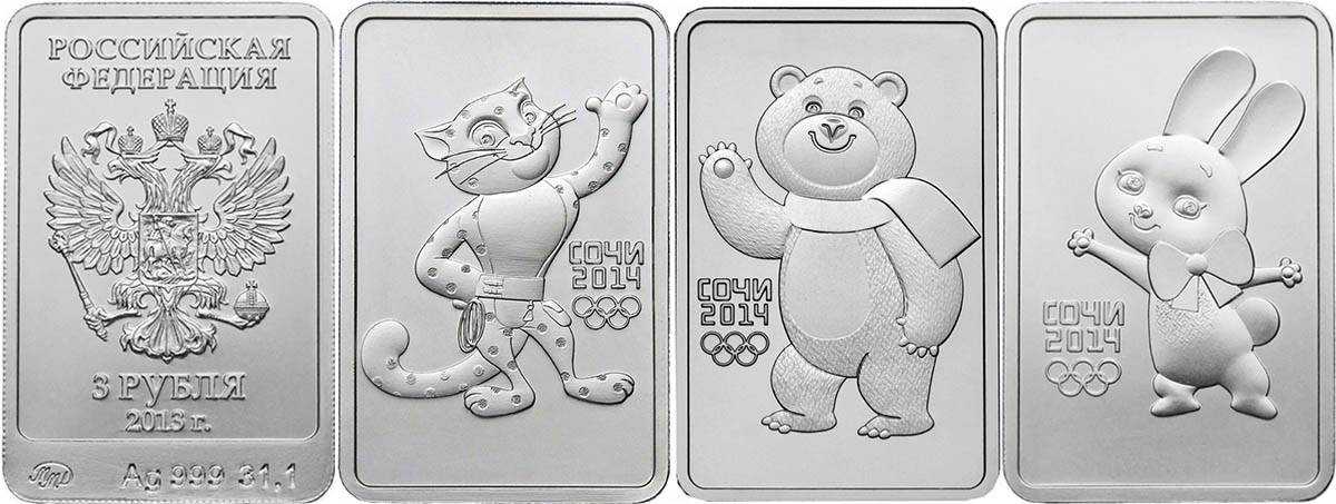 - Серебряная монета «Сочи 2014» номиналов в 3 рубля, выпушена из серебра 999 пробы, вес монеты 31,1 грамма. Выпускалась в 2011-2013 годах тиражом до 300 000 рублей, но достоверных данных о количестве выпущенных монет нет. Как и в случае с золотой монетой выгоднее покупать монеты с «Зайкой» и «Мишкой», но достать их уже не просто.
