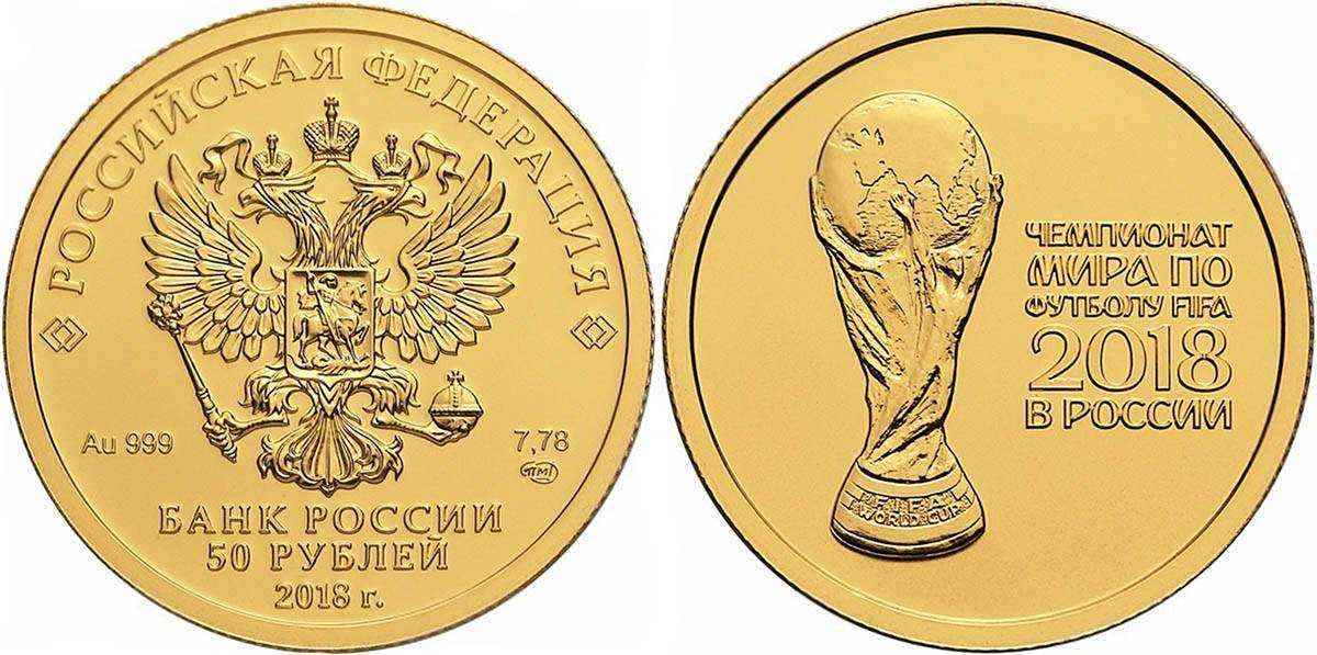- Золотая монета «Чемпионат мира по футболу 2018» номиналом в 50 рублей, монета весит 7,78 грамм, выполнена из золота 999 пробы. Выпушены тиражом в 100 000 рублей. Монеты обладают высокой тематической ценностью, а если заявленный тираж будет значительно меньше фактического, то их ценность повысится в разы.