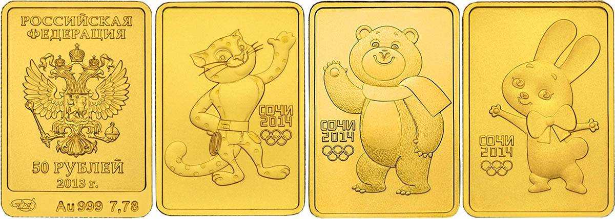 - Золотая монета «Сочи 2014» выпущены номиналами в 50 и в 100 рублей из золота 999 пробы, каждая монета в 50 рублей весит по 7,78, а монета в 100 рублей – 15,55 грамм. Выпускались монеты в 2011 -2013 годах тиражом в 300 000. Выгоднее всего будет приобрести монеты с талисманами игр «Мишка» и «Зайка», но найти их не так просто уже.