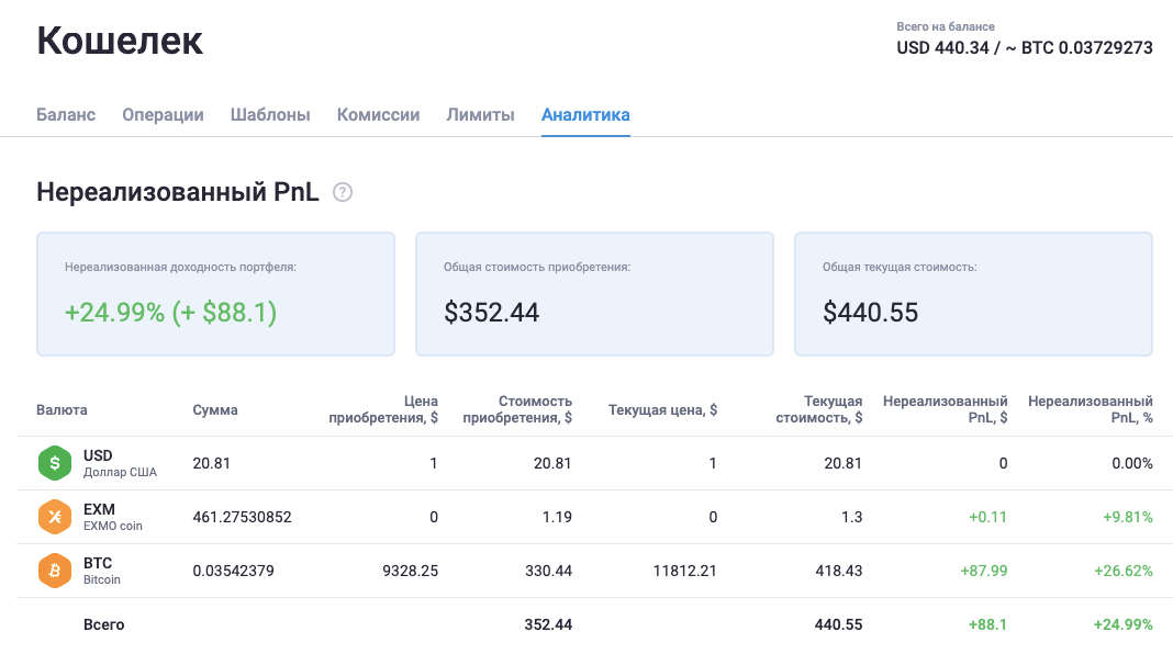 Для расчета стоимости владения каждым активом вашего портфеля (средневзвешенная стоимость приобретения) учитываются все вводы и покупки данного актива в долларовом эквиваленте на момент совершения операций. Выводы и продажи актива не влияют на средневзвешенную стоимость, а только уменьшают его количество в вашем портфеле.