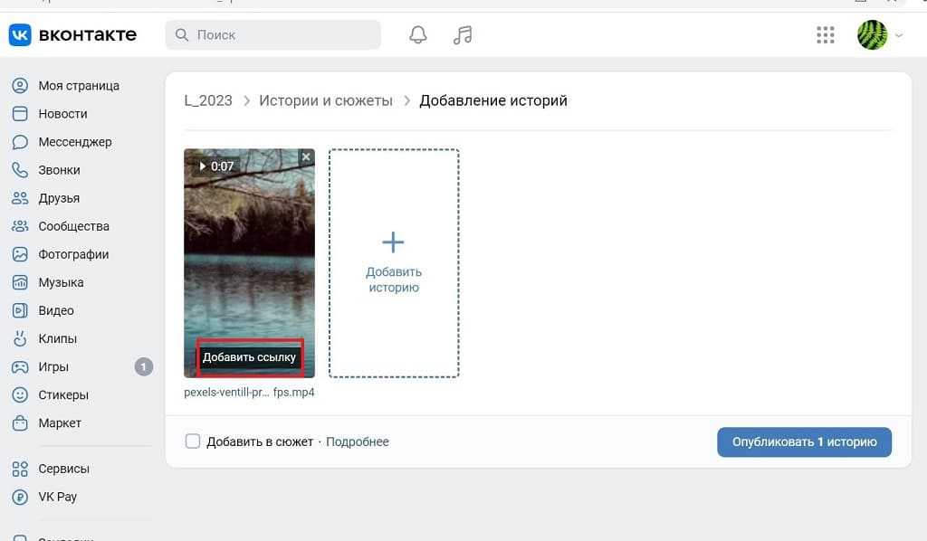 Во время создания сторис, сразу после загрузки фото или видео, внизу появляется надпись «Добавить ссылку». После нажатия на нее в открывшемся окошке можно делать вставку url для перехода на нужный сайт, профиль или сообщество во ВКонтакте.