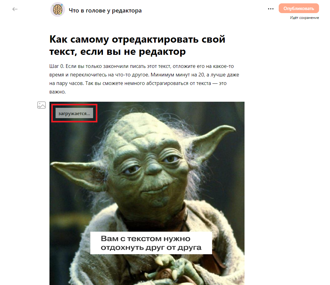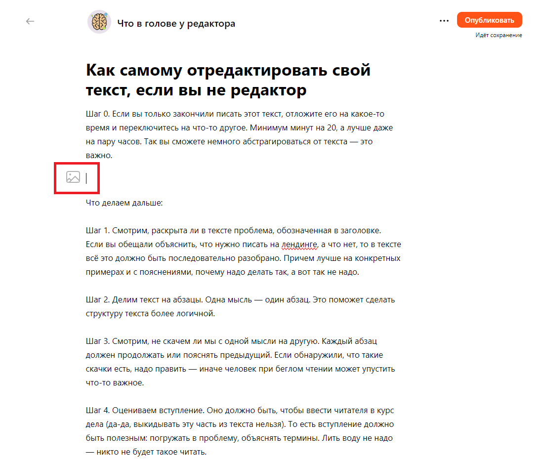 Шаг 2. Добавьте текст статьи в соответствующие поля, оформите выделения и подзаголовки. Затем выберите место, куда вы хотите добавить изображение, и добавьте пустую строку. Тогда слева от строки появится иконка с картинкой.