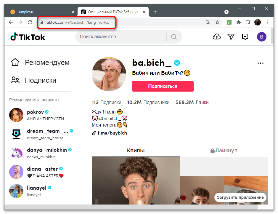 К сожалению, пока в браузере нет доступных функций для гибкого взаимодействия с профилями других пользователей. Если вам понадобилось скопировать ссылку на учетную запись одного из блогеров, выделите ее в адресной строке и нажмите стандартную комбинацию клавиш Ctrl + C. Если нужно исключить привязку языка локализации в ссылке и сделать ее меньше, копируйте все содержимое до знака вопроса (его и последующие символы можно не копировать).