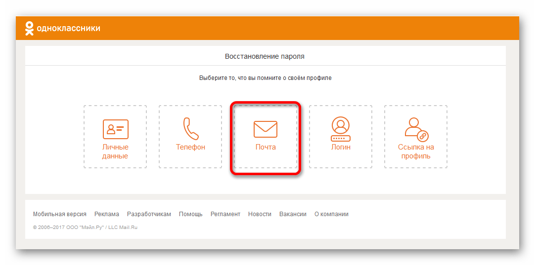 На странице выбора варианта восстановления пароля щелкаем на кнопку «Почта», чтобы установить новый пароль средствами электронной почты, прикрепленной к странице в Одноклассниках.
