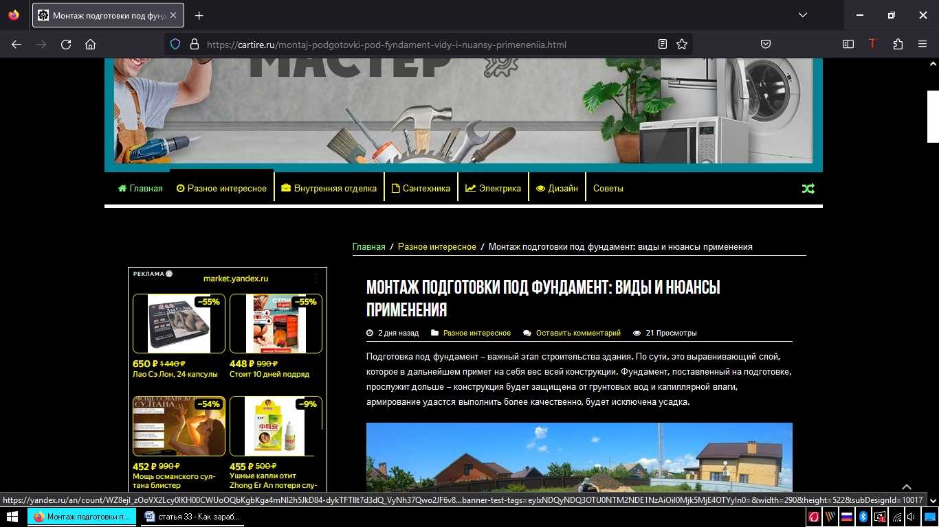 Другой пример, на скриншоте ниже вы наблюдаете другой мой сайт, где я зарабатываю на рекламе от Яндекса. То есть, я разместил код, который генерирует мне показ данной рекламы, а мне начисляются деньги, как за показ, так и за клик. Заметьте, данное действие происходит также на полном пассиве.