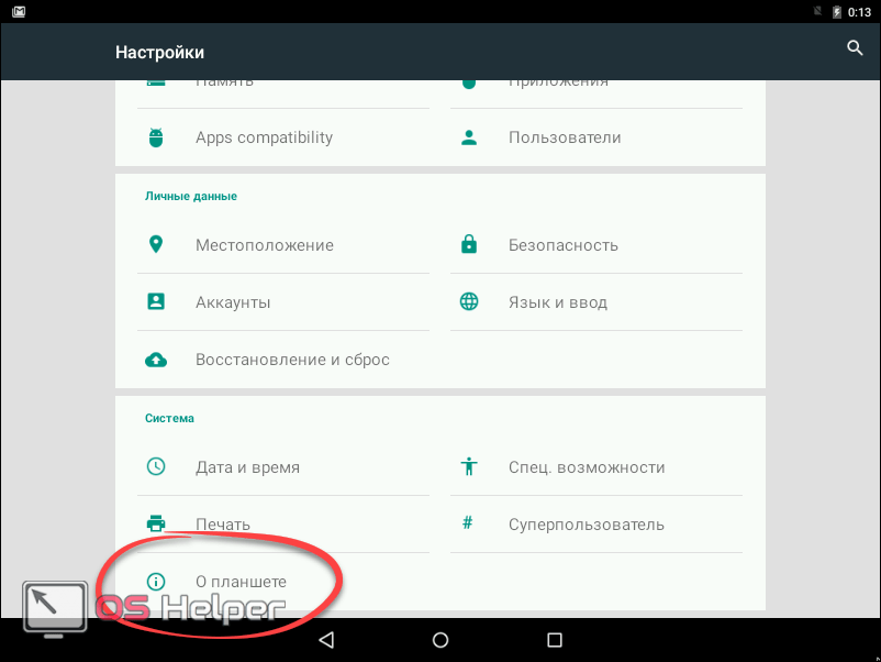 - Крутим содержимое окна в самый низ и выбираем пункт «О планшете» или «О телефоне».
