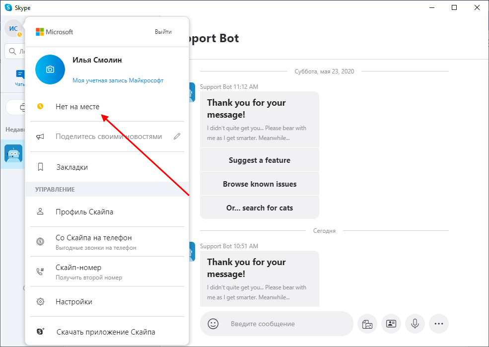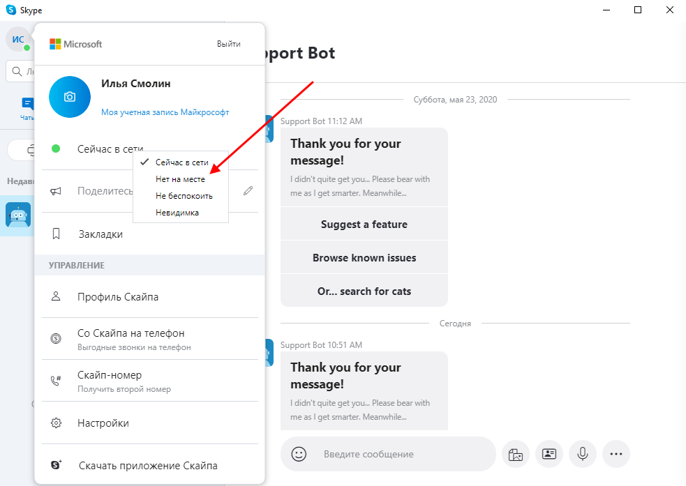 Изменить статус в мобильном приложении Skype можно следующим способом: